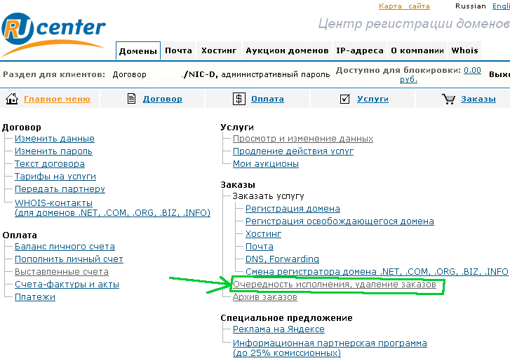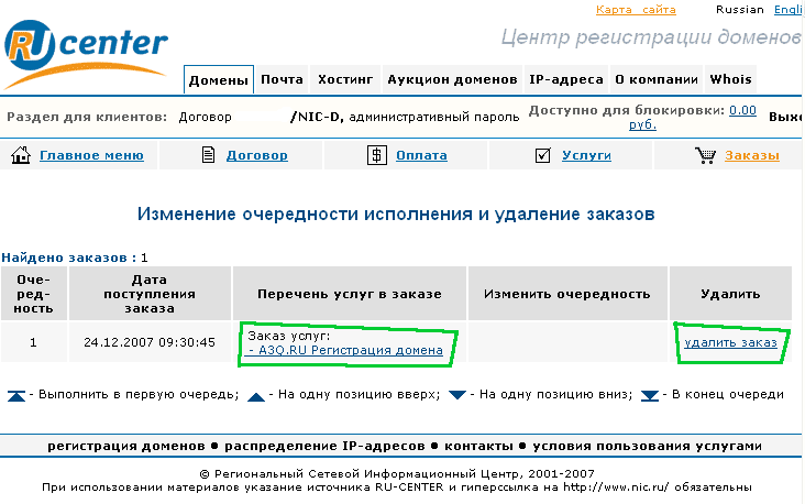 | 14 | Если вы не сразу оплачивали заказанный домен то в любое другое время заказ на его регистрацию можно найти в вашем аккаунте по ссылке "Очередность исполнения и удаления заказов" |