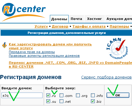 проидя по ссылке "A3Q.RU регистрация домена" . Если вы наконец накопили 600 рублей на покупку домена и решили его купить, вам надо будет завести эти 600 рублей на Ваш аккаунт Руцентра и тогда деньги на вашем аккаунте сразу пойдут на исполнение вашего заказа по регистрации домена. Если вы передумали покупать этот домен то вам надо пройти по ссылке "Удалить заказ" |