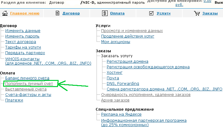 | 16 | Что бы завести 600 рублей на аккаунт для покупки домена надо пройти по ссылке "Пополнить счет" |