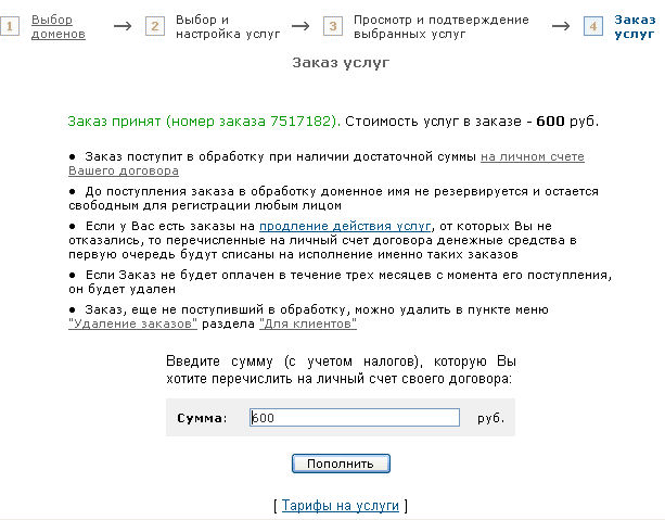 вашего счета будет спитываться ссумма равная стоимость домена. В нашем случае зачислим ровно столько сколько требуется для регистрации одного домена. То есть 600руб. Жмем кнопку пополнить |