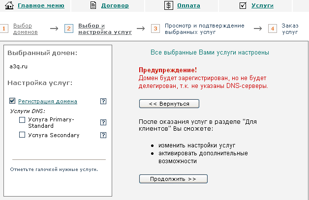 хостингом, это мы сделаем позже, нам главное сейчас зарегистрировать домен. Поэтому принимаем предупреждение к сведению и идем далее регистрировать. Жмем продолжить. |