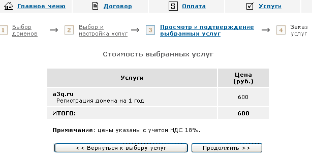 регистрируемого нами домена - 600руб. жмем на кнопку продолжить. |